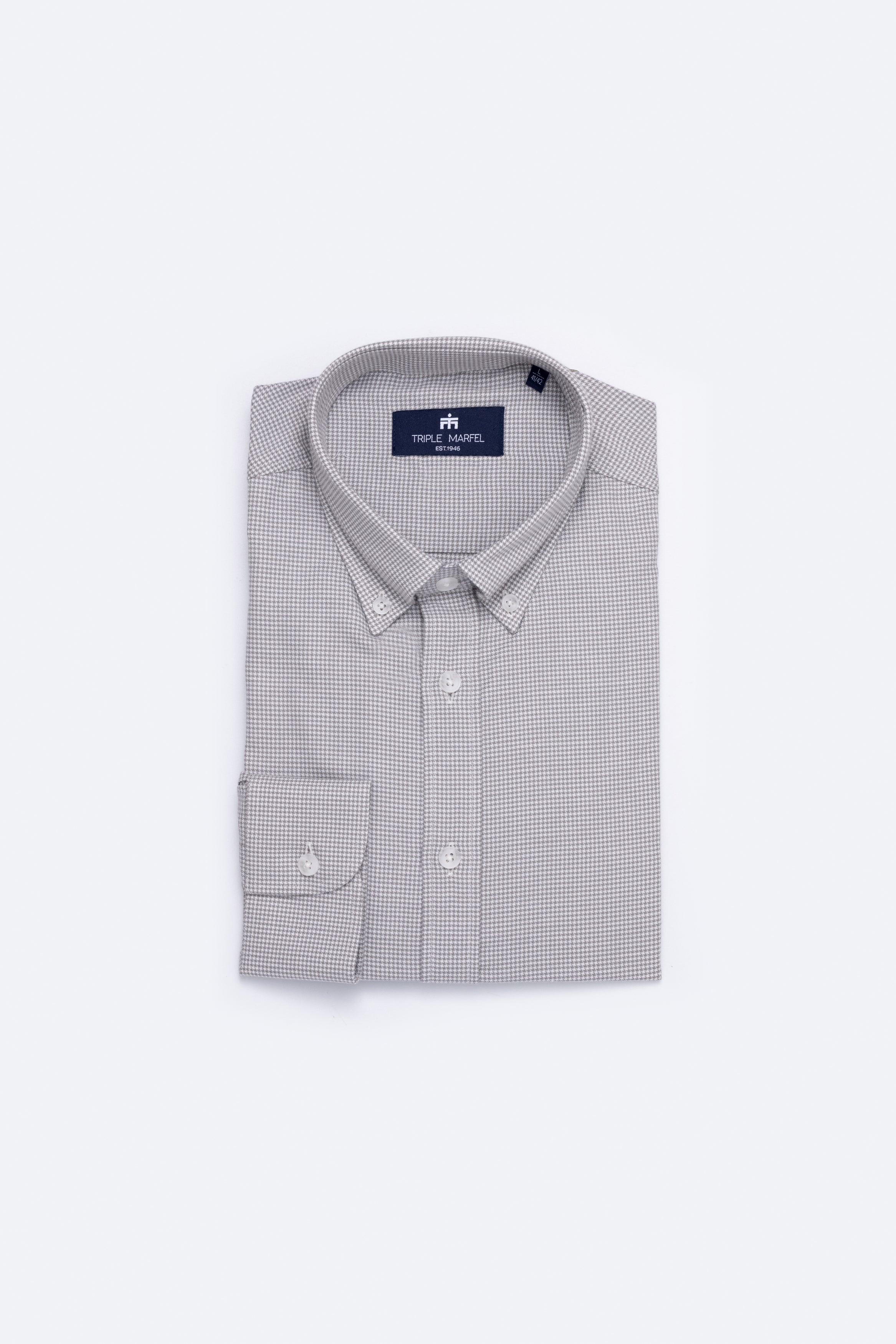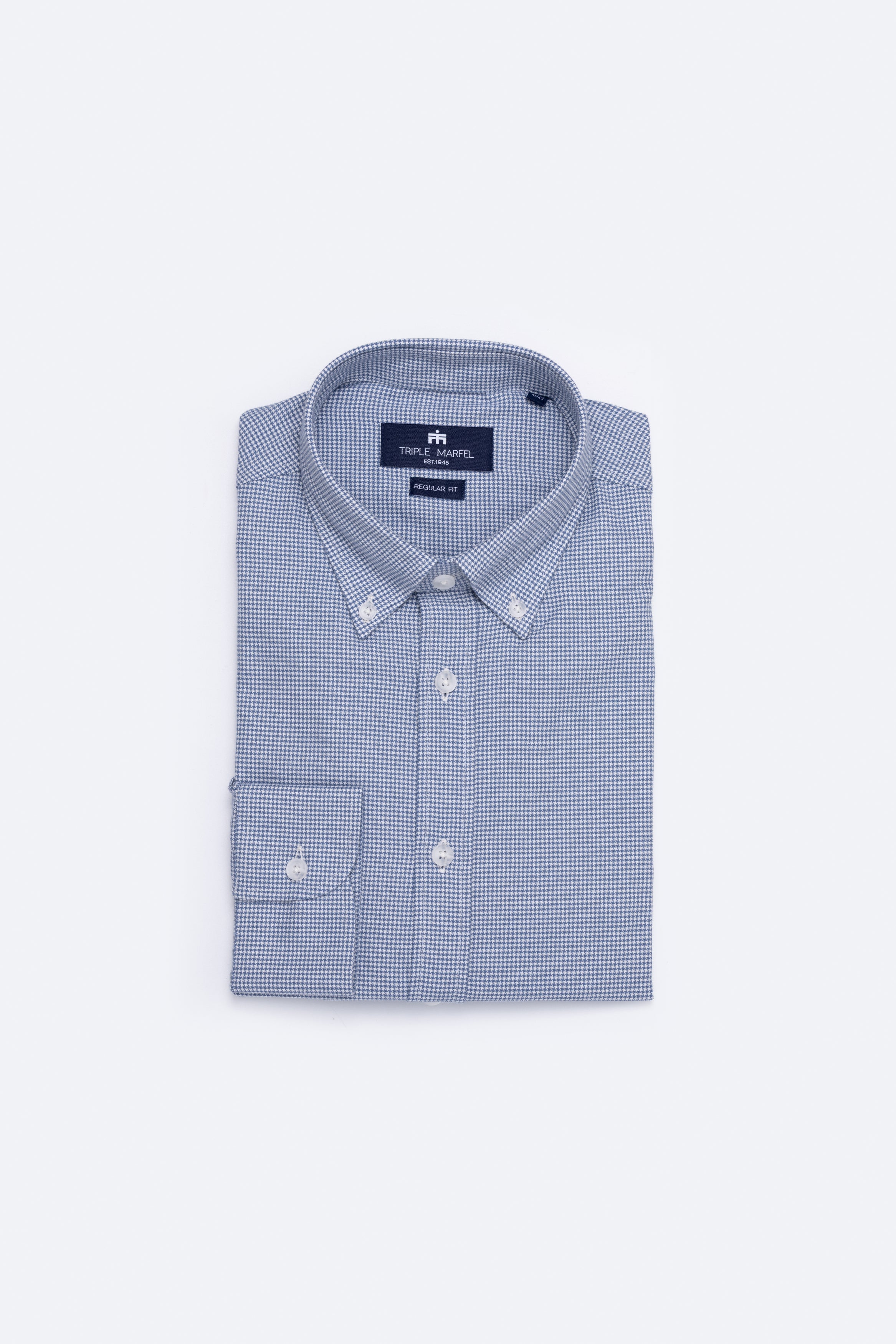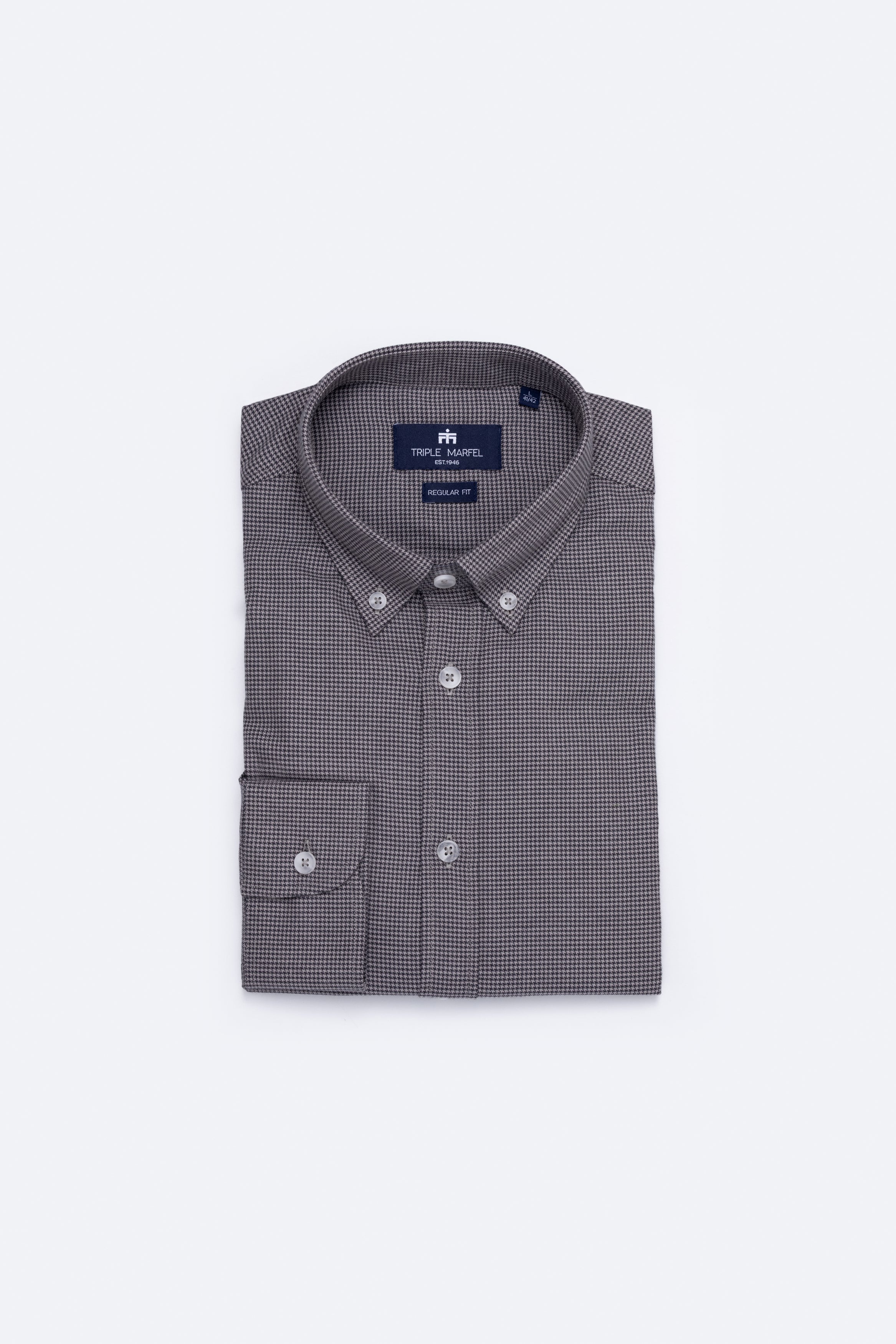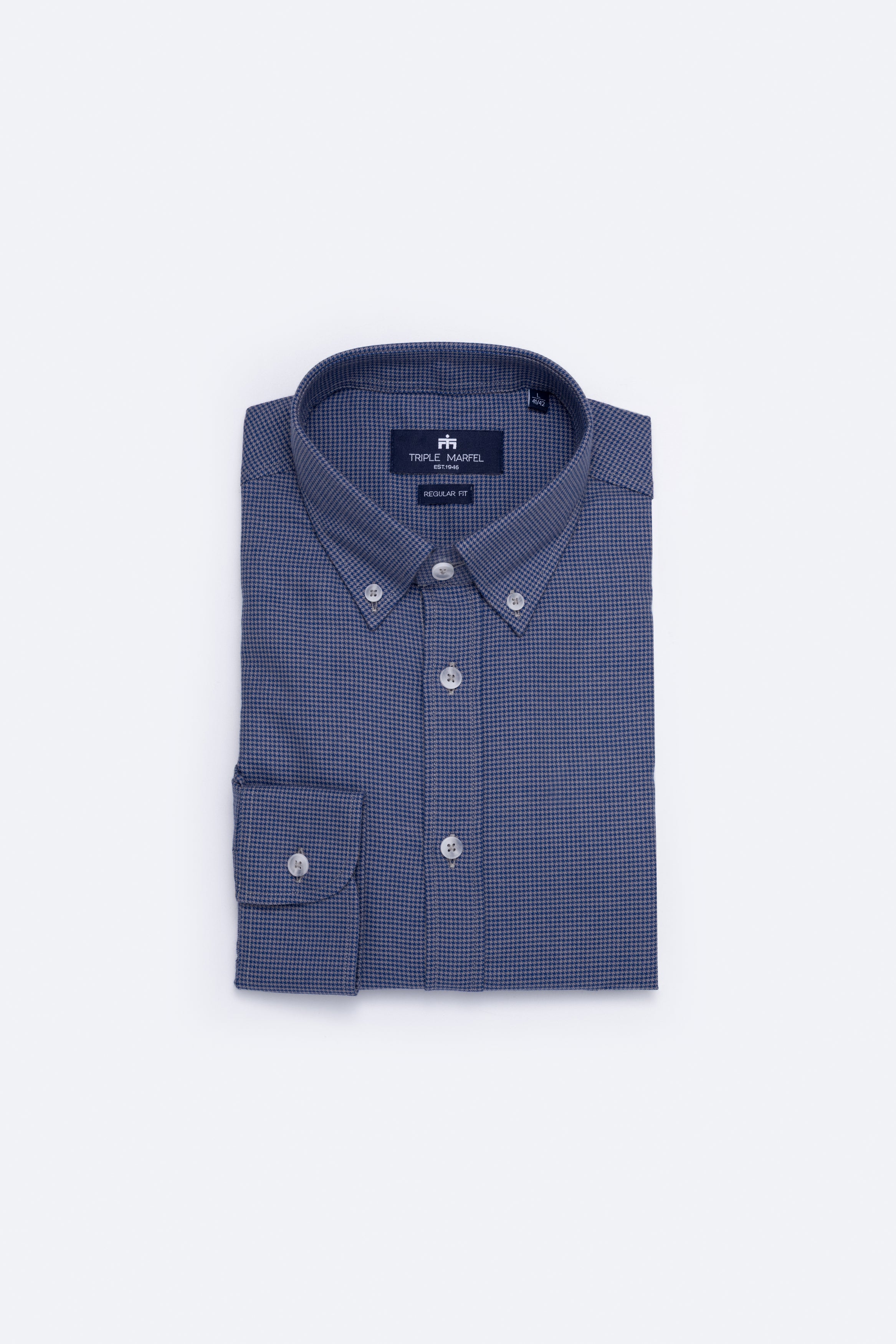 Camisa de manga comprida com padrão pied-de-poule, confecionada em tecido de algodão fabricado em Portugal por um dos nossos parceiros de longa data. Confeccionada no nosso corte regular, a camisa apresenta colarinho com botões e punhos arredondados, adornada com os nossos botões raiados.