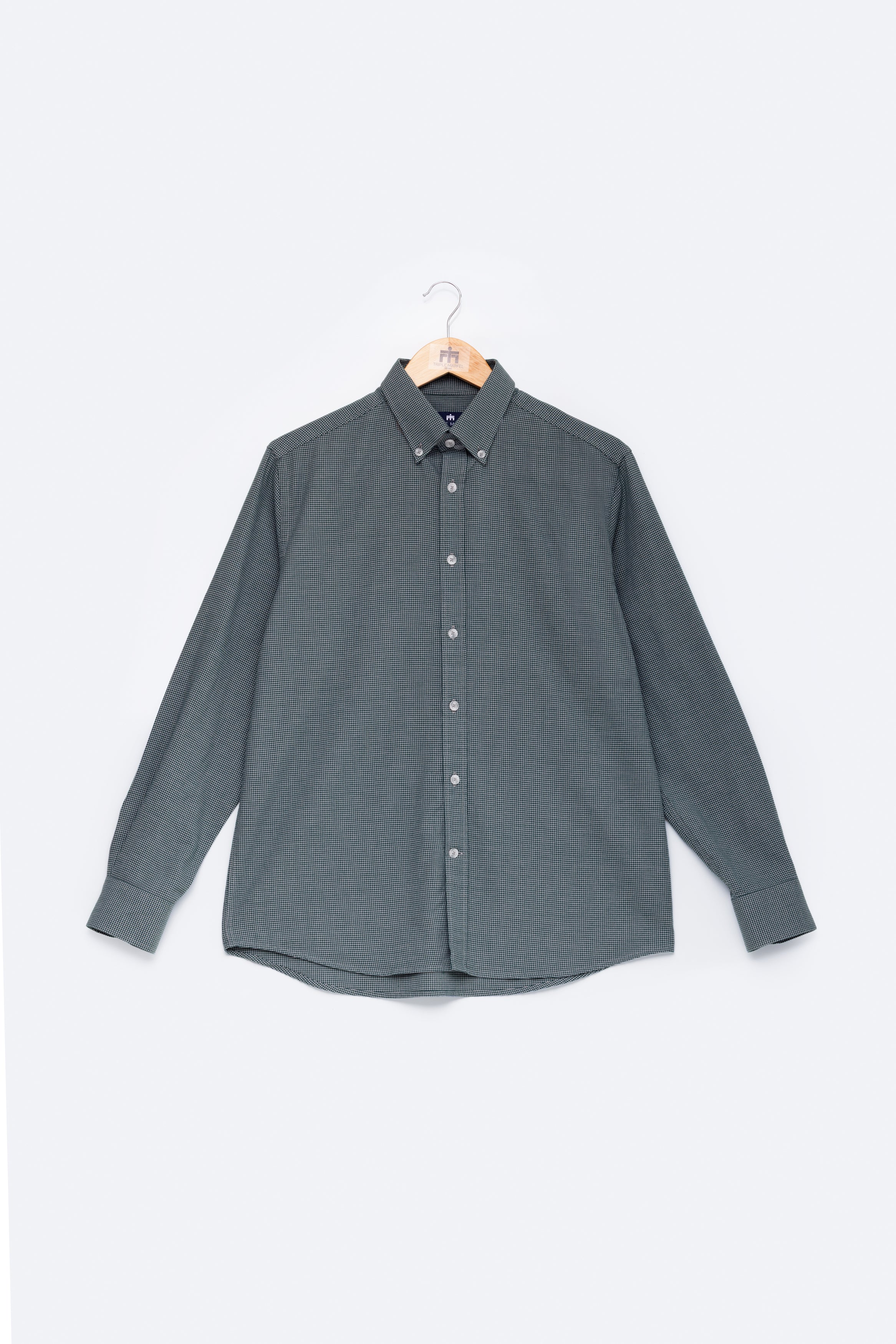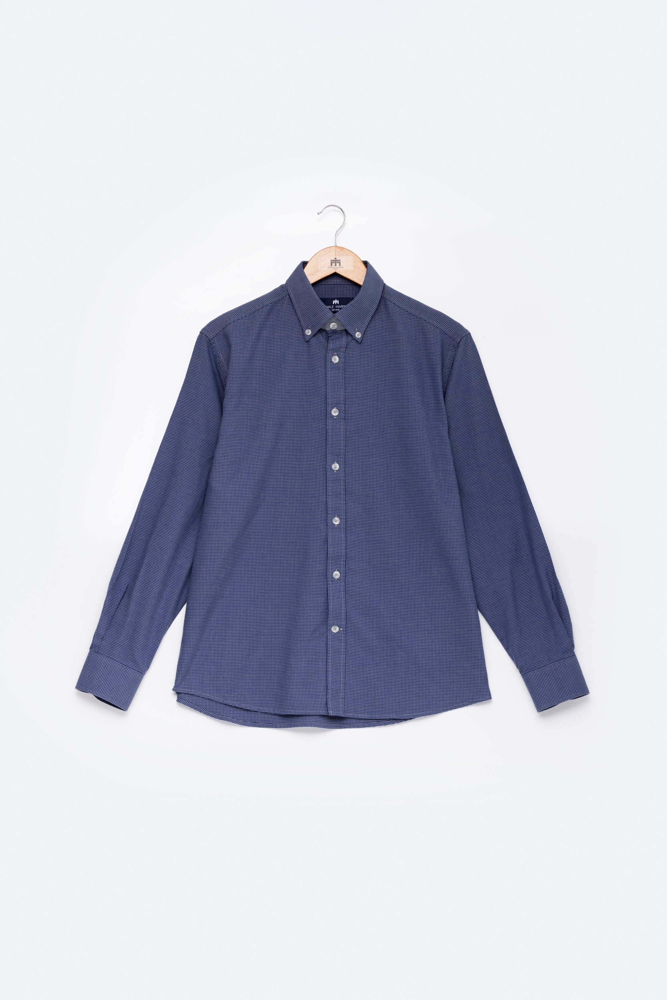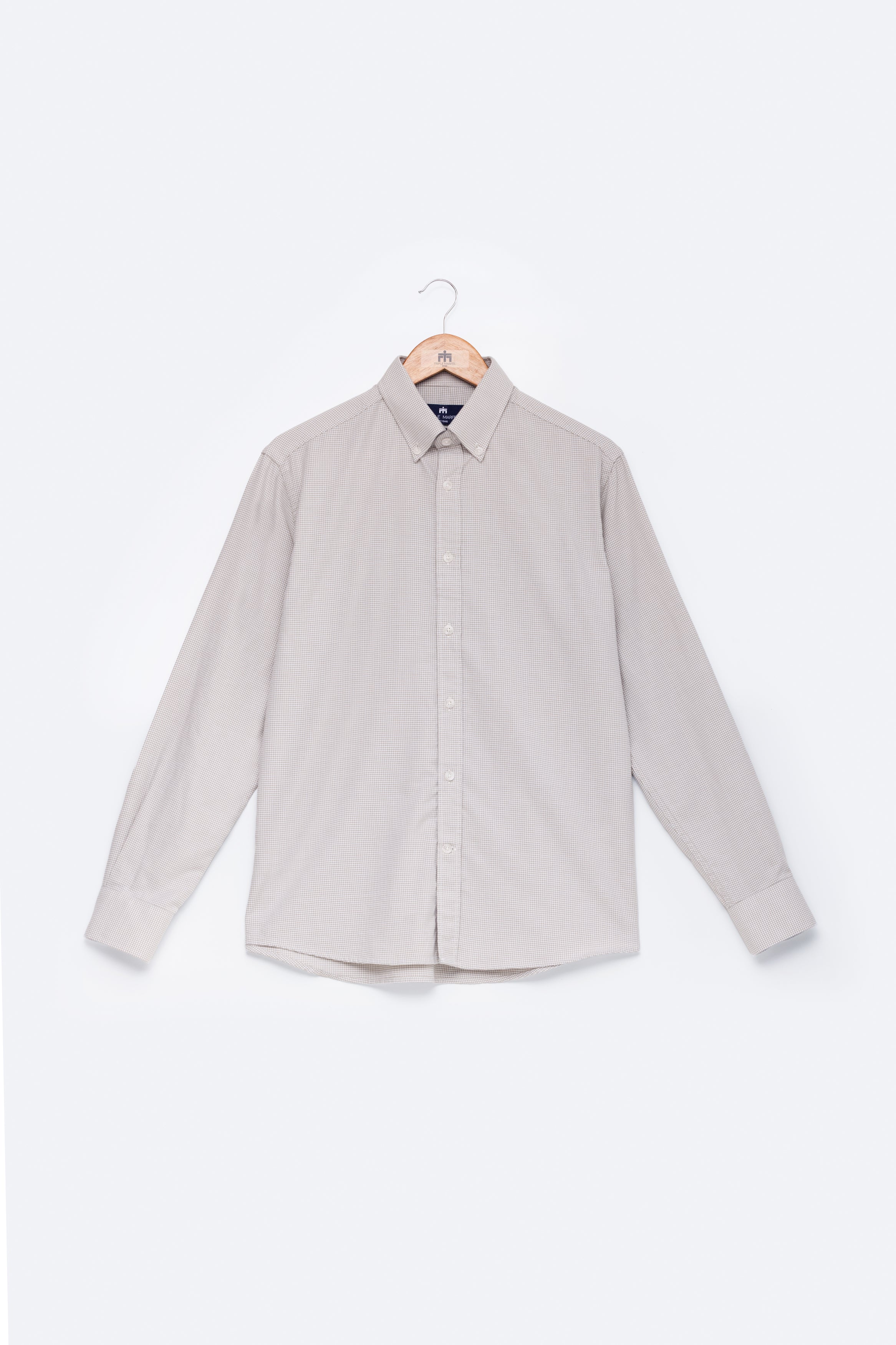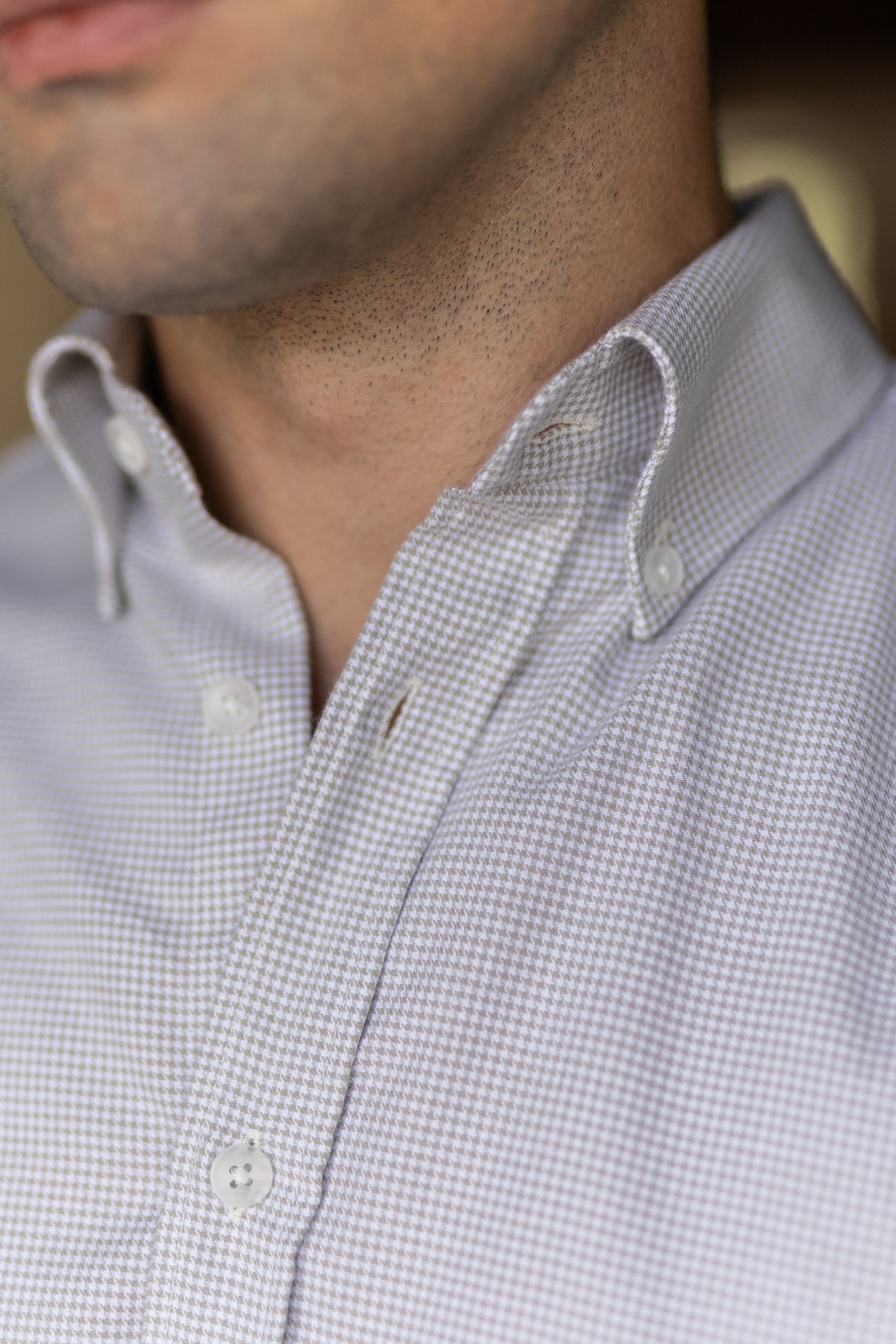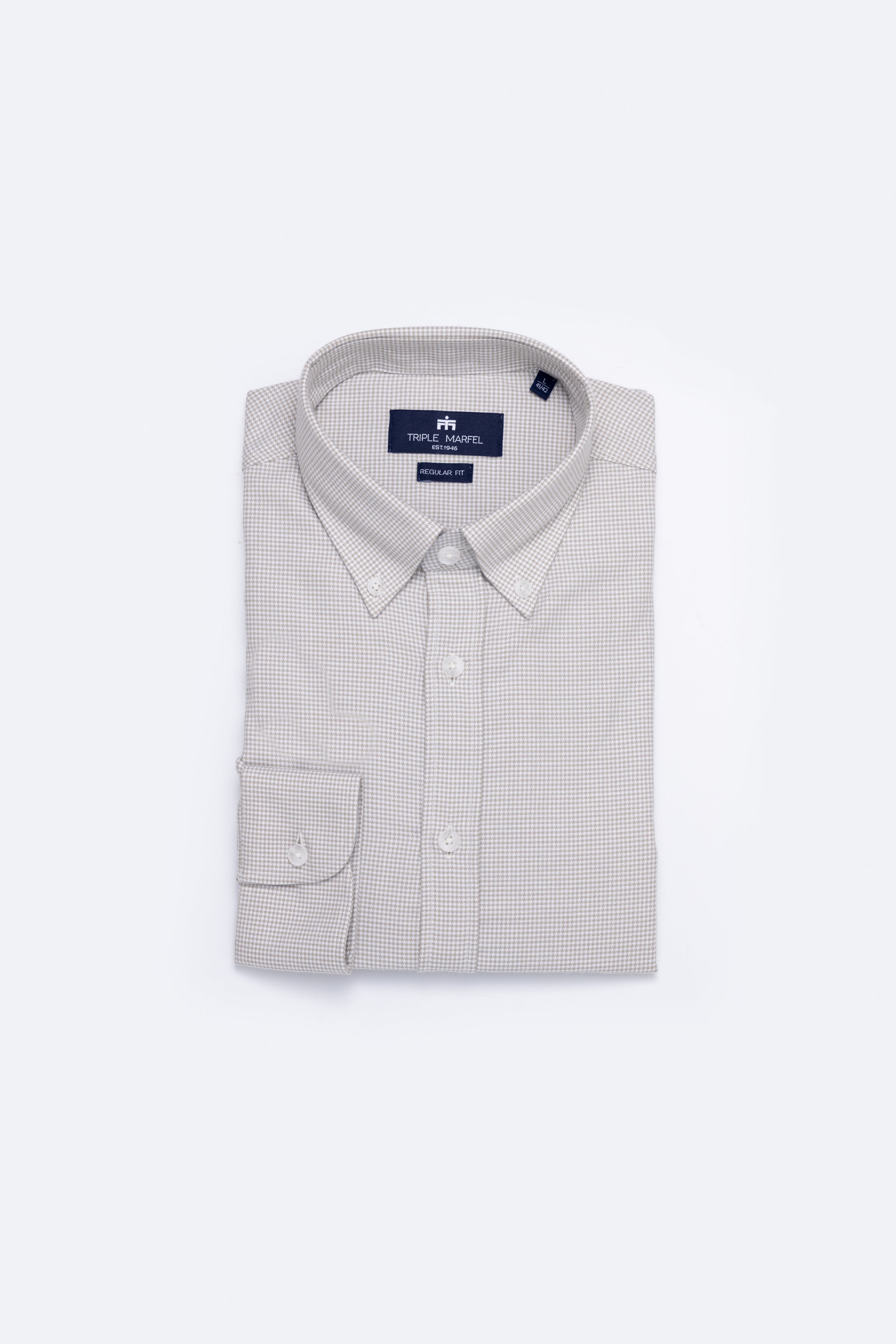 Camisa de manga comprida com padrão pied-de-poule, confecionada em tecido de algodão fabricado em Portugal por um dos nossos parceiros de longa data. Confeccionada no nosso corte regular, a camisa apresenta colarinho com botões e punhos arredondados, adornada com os nossos botões raiados.