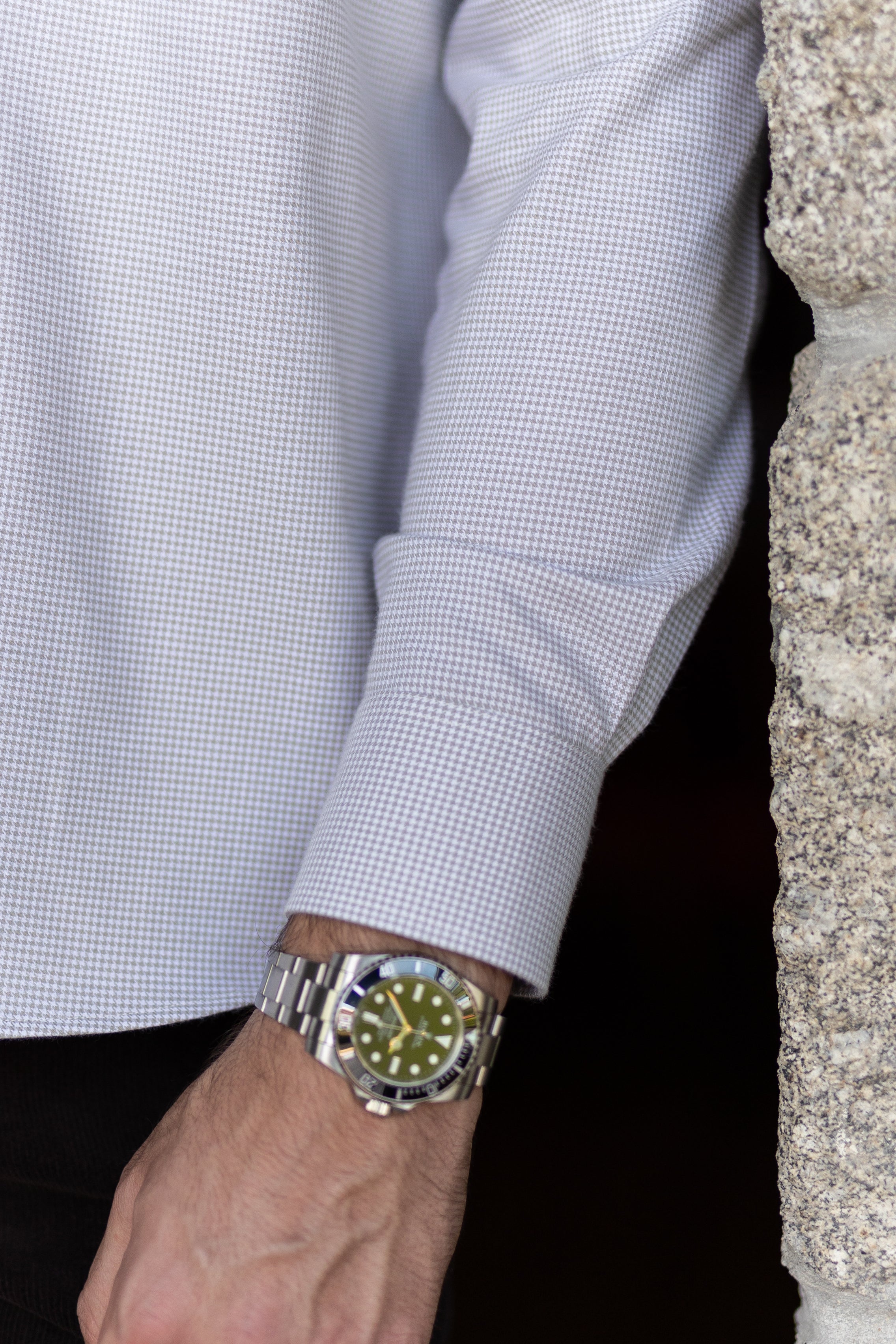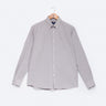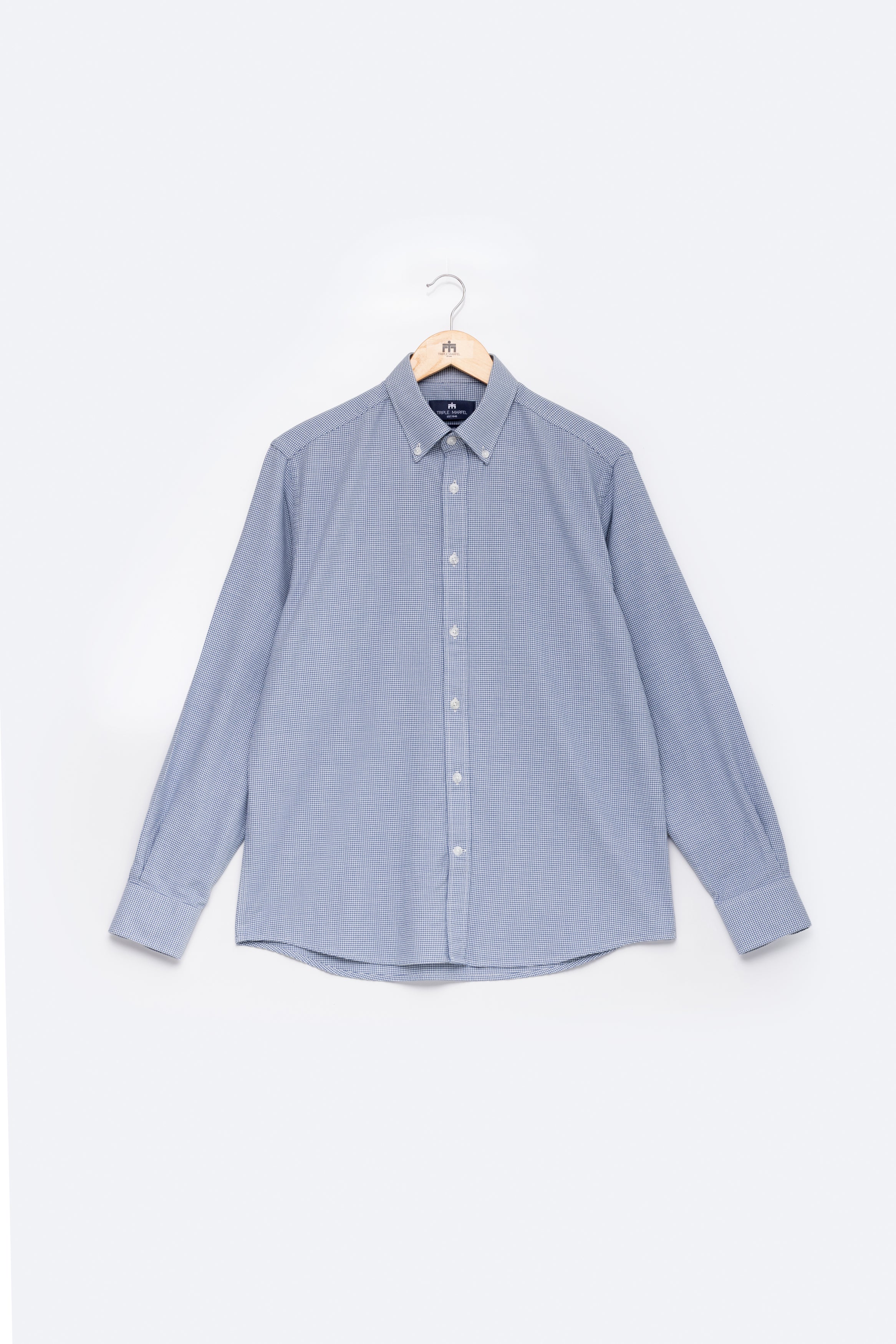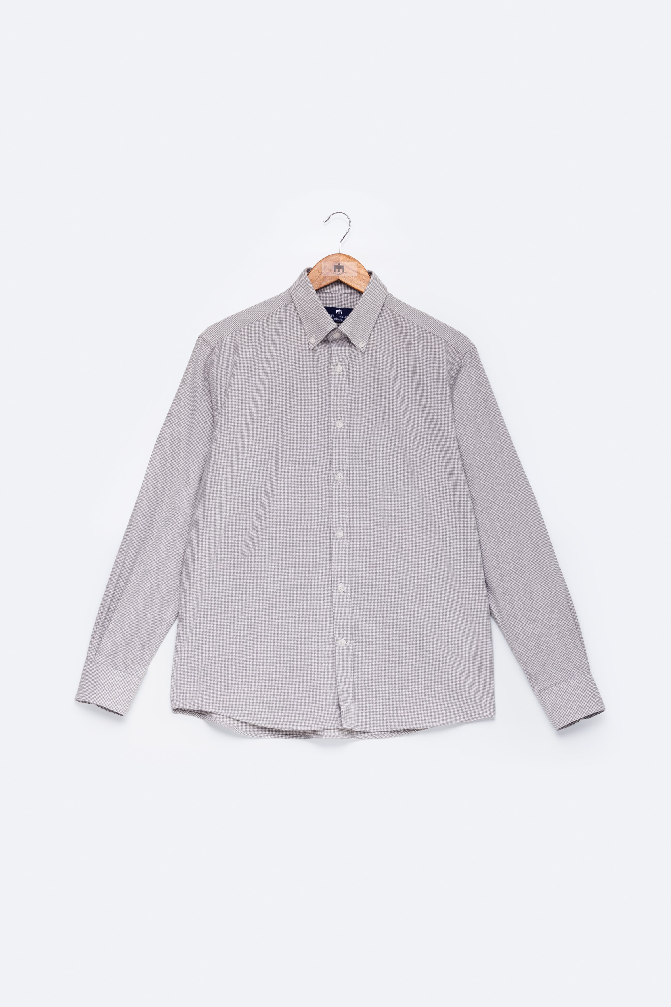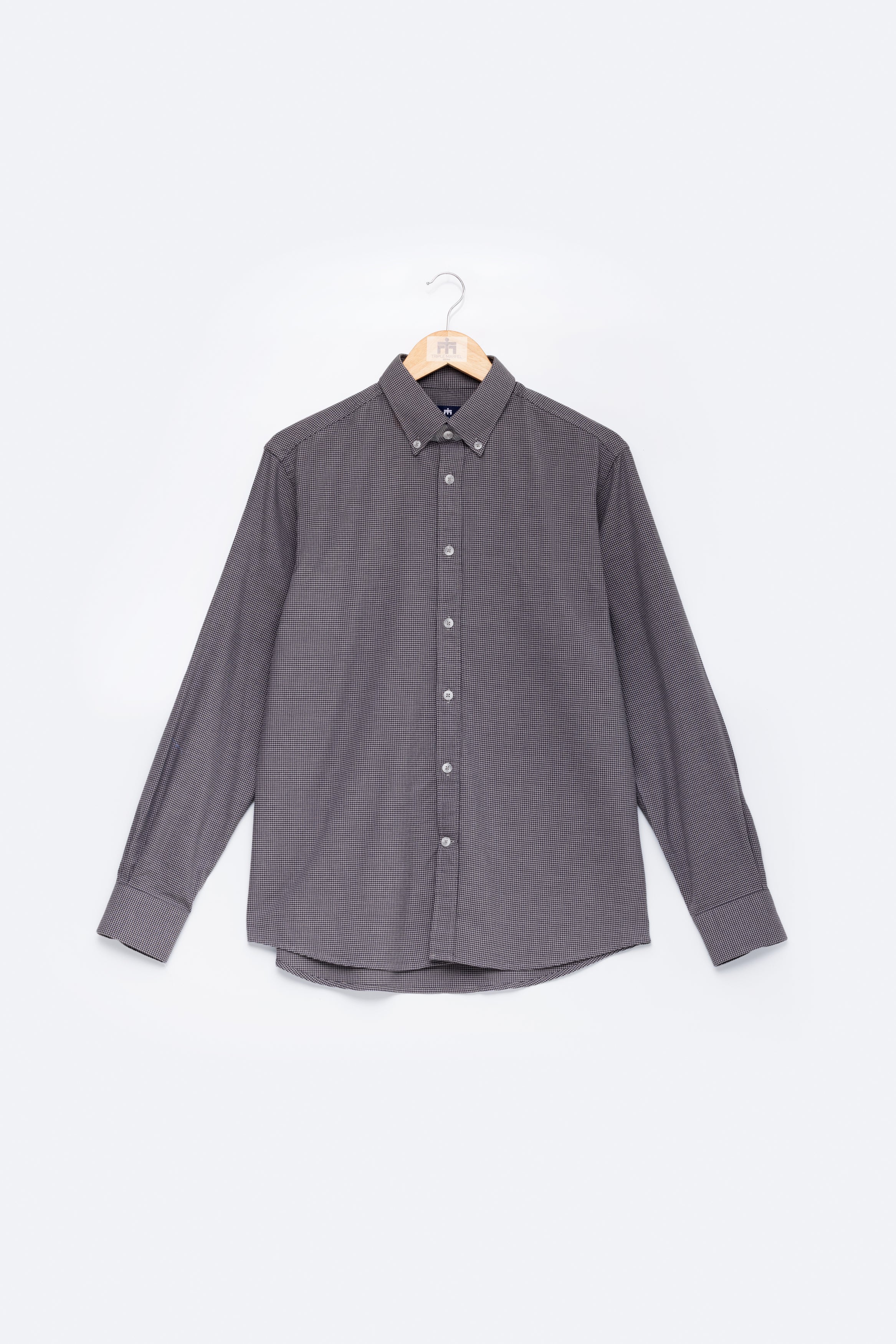 Camisa de manga comprida com padrão pied-de-poule, confecionada em tecido de algodão fabricado em Portugal por um dos nossos parceiros de longa data. Confeccionada no nosso corte regular, a camisa apresenta colarinho com botões e punhos arredondados, adornada com os nossos botões raiados.