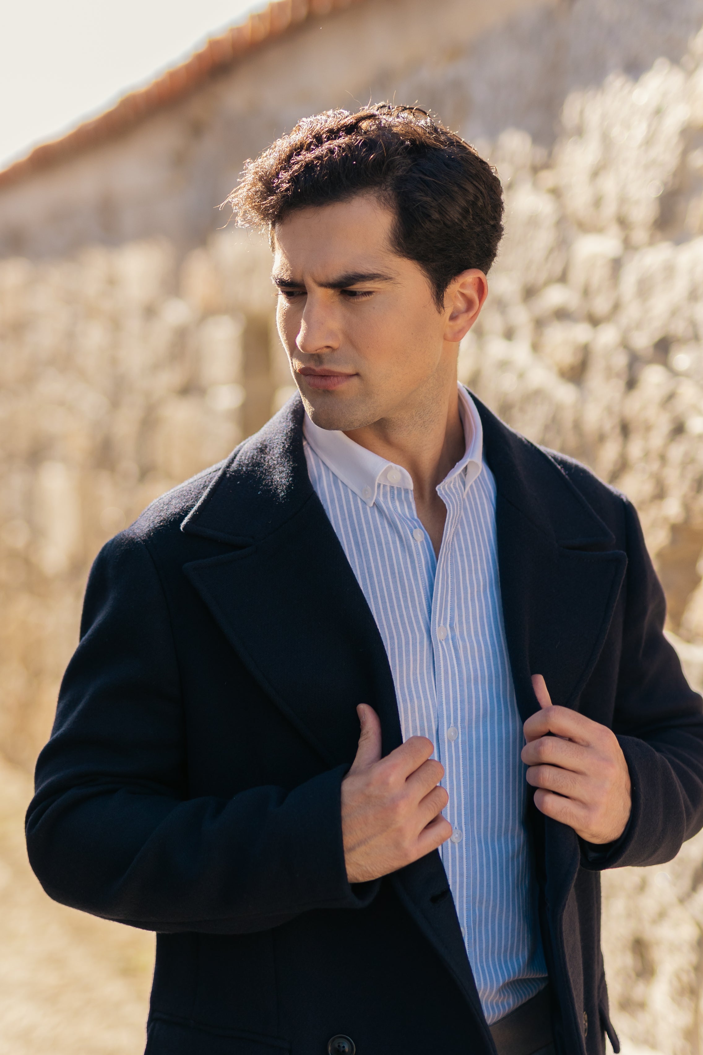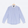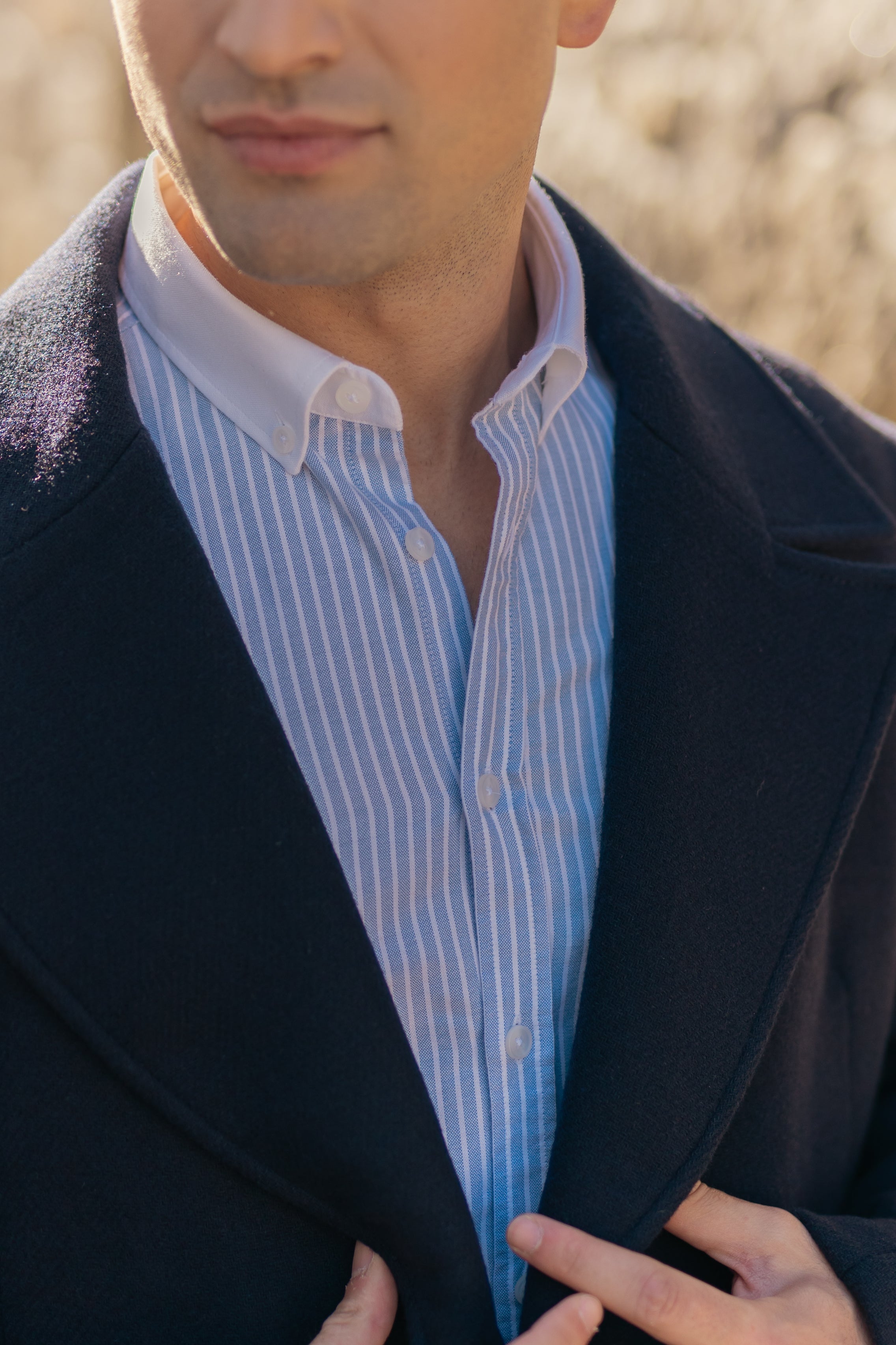 Camisa Oxford clássica com padrão de riscas em azul e branco, confecionada em tecido 100% algodão produzido em Portugal por uma das mais prestigiadas e antigas tecelagens. Confecionada em corte slim fit, apresenta colarinho com botão em contraste e é adornada com botões raiados. Perfeita para um visual refinado e contemporâneo, adequada para contextos casuais, clássicos e smart-casual.