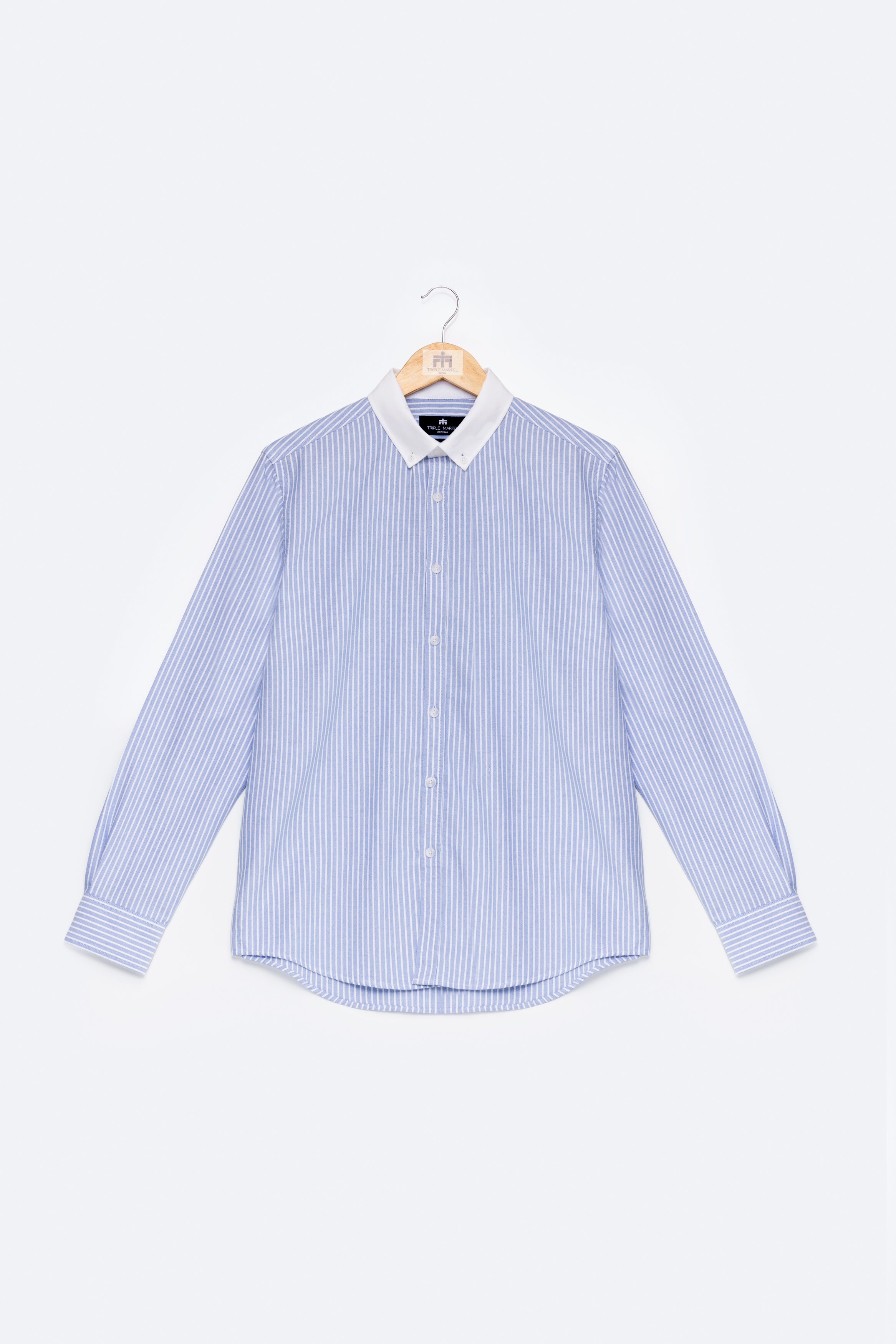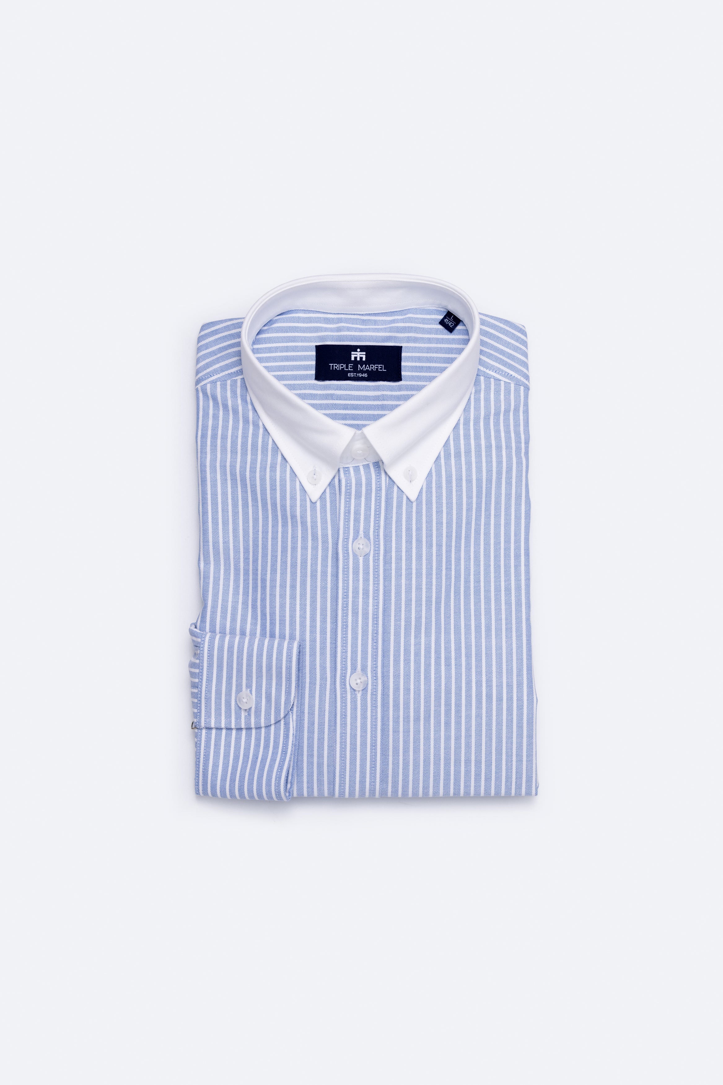 Camisa Oxford Riscas Azul Colarinho Contraste Slim