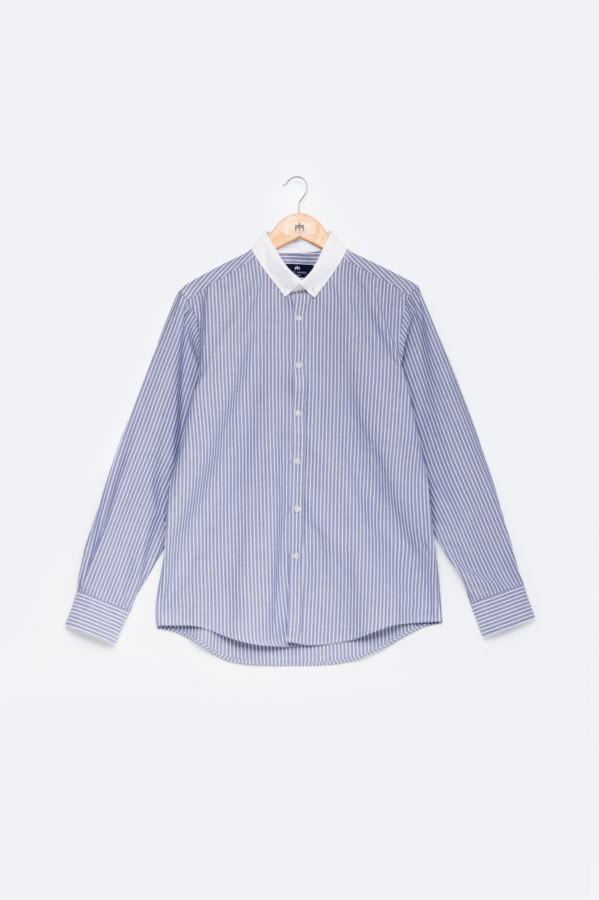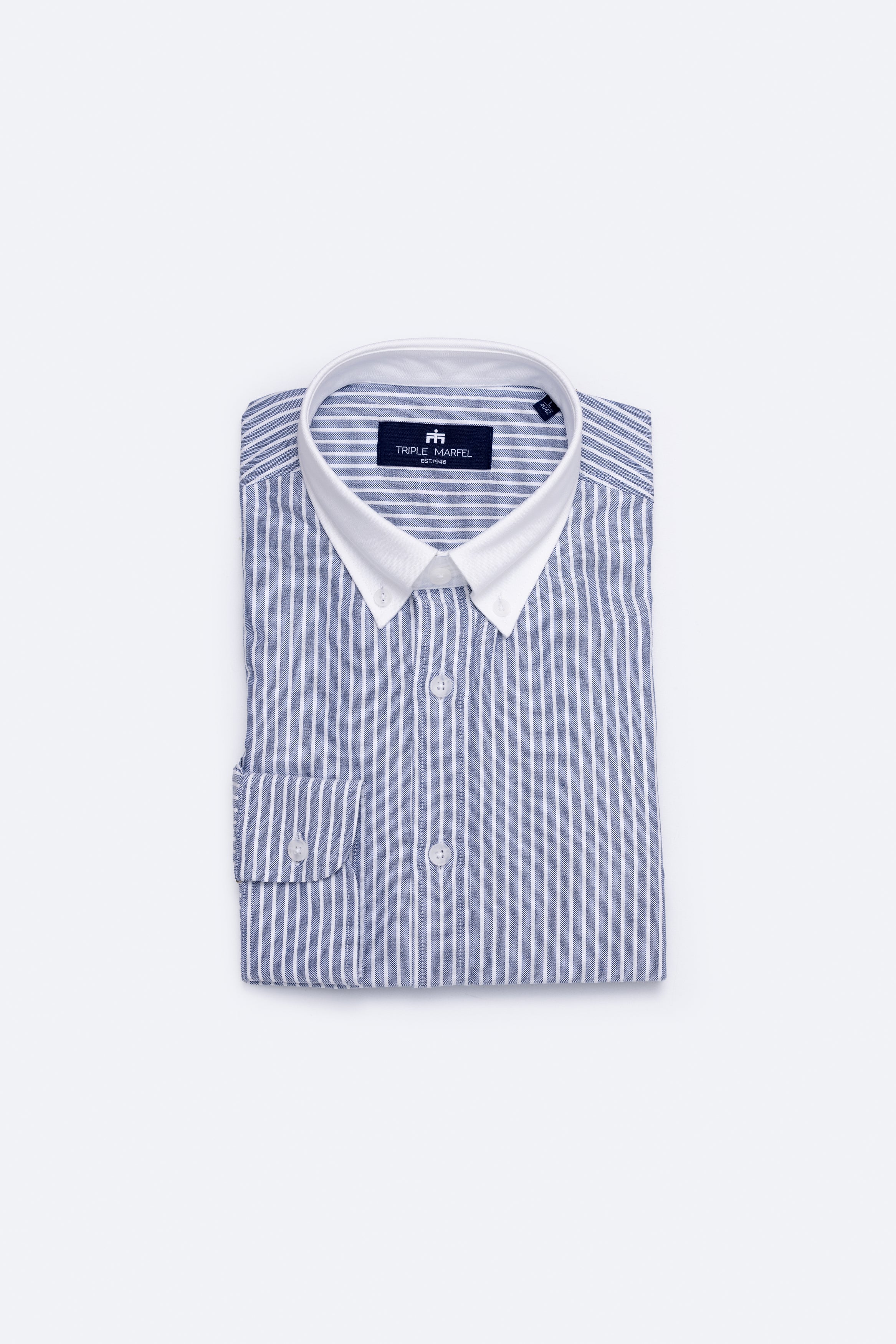 Camisa Oxford Riscas Marinho Colarinho Contraste Regular