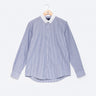 Camisa Oxford clássica com padrão de riscas em azul marinho e branco, confecionada em tecido 100% algodão produzido em Portugal por uma das mais prestigiadas e antigas tecelagens. Confecionada em corte regular fit, apresenta colarinho com botão em contraste e é adornada com botões raiados. Perfeita para um visual refinado e contemporâneo, adequada para contextos casuais, clássicos e smart-casual.