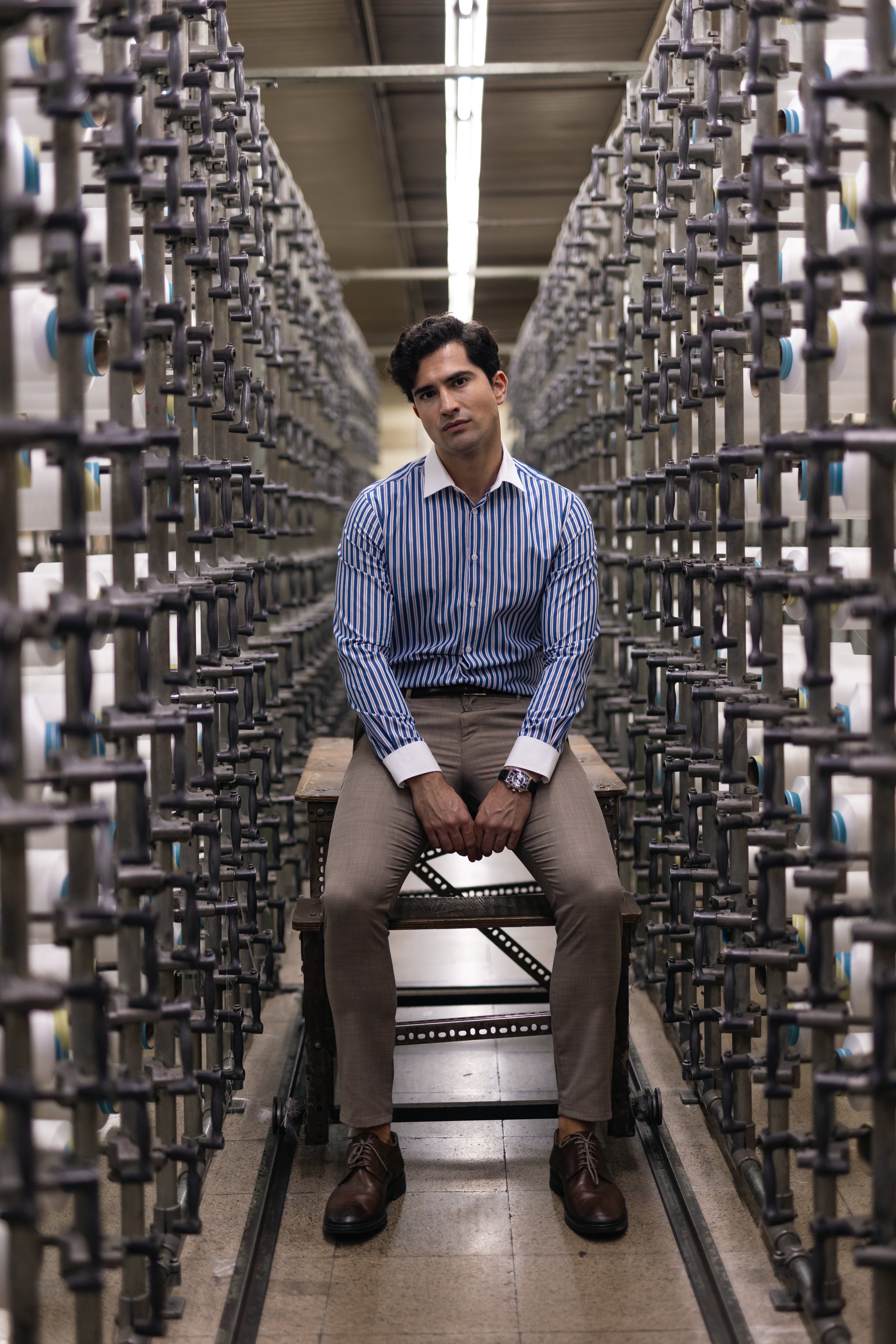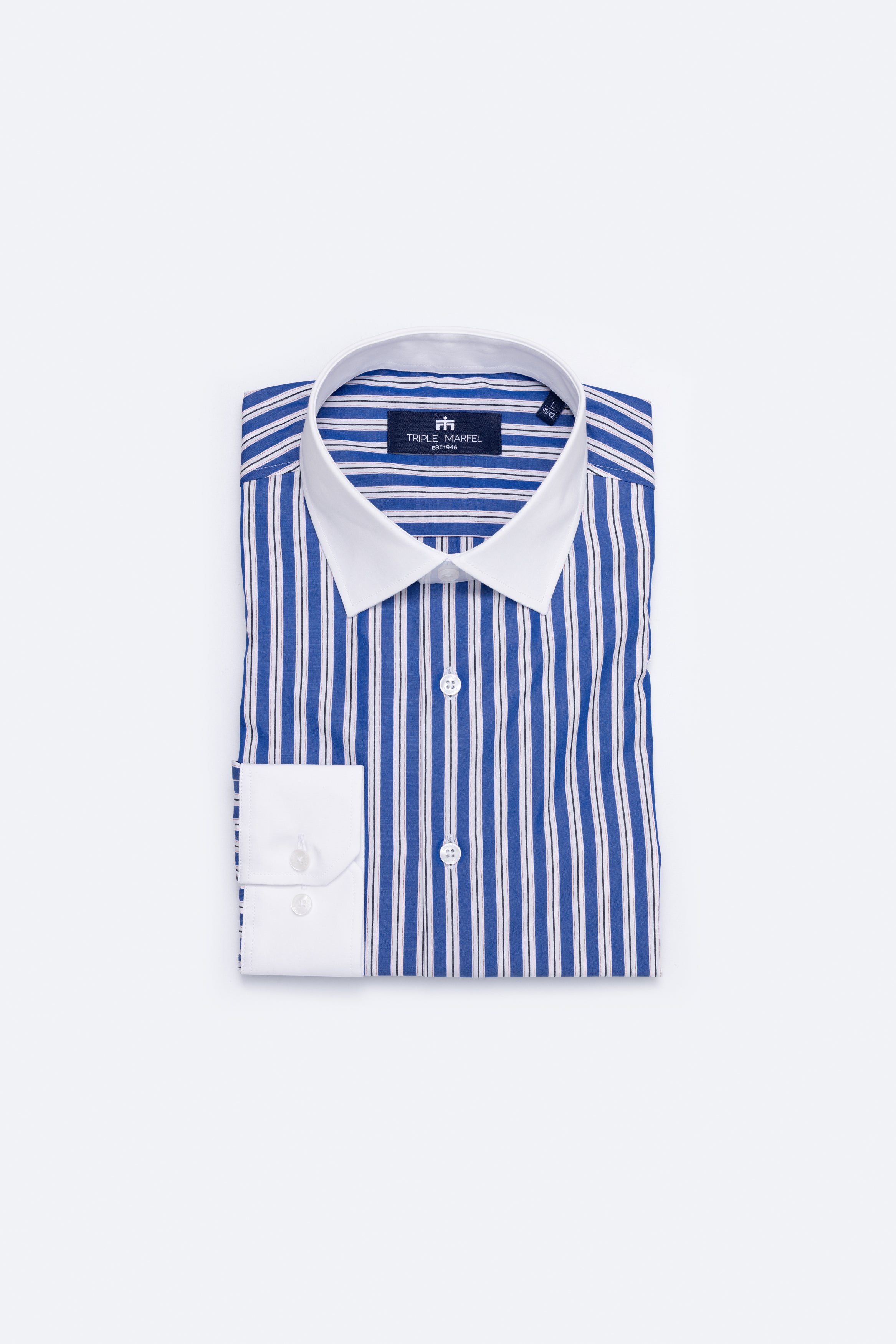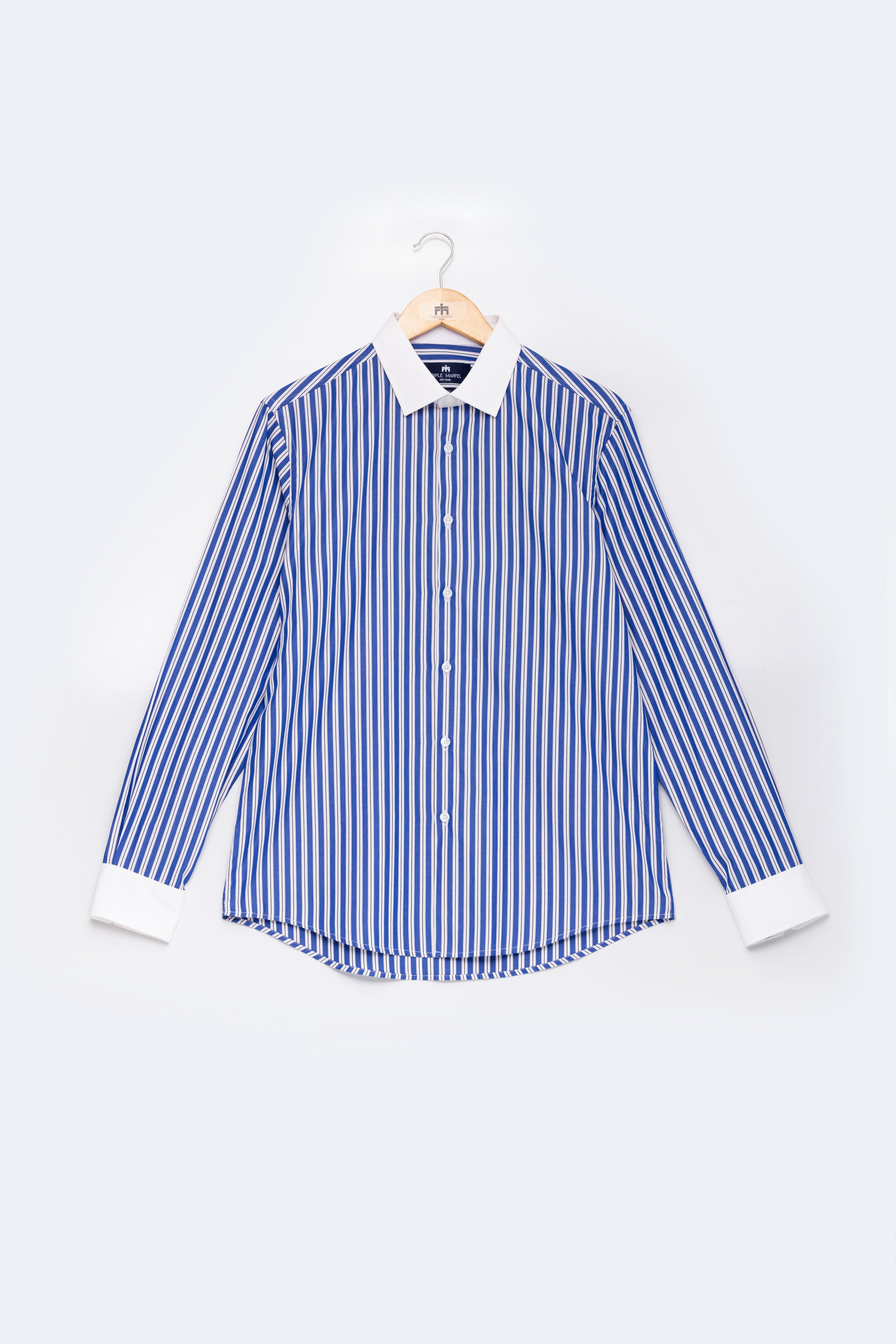 Camisa clássica em 100% algodão, com riscas verticais em azul royal e branco, e subtil detalhe preto e vermelho. Apresenta-se em corte slim fit, com colarinho e punhos brancos em contraste, aprimorada com os nossos botões signature. Ideal para um look refinado e contemporâneo.