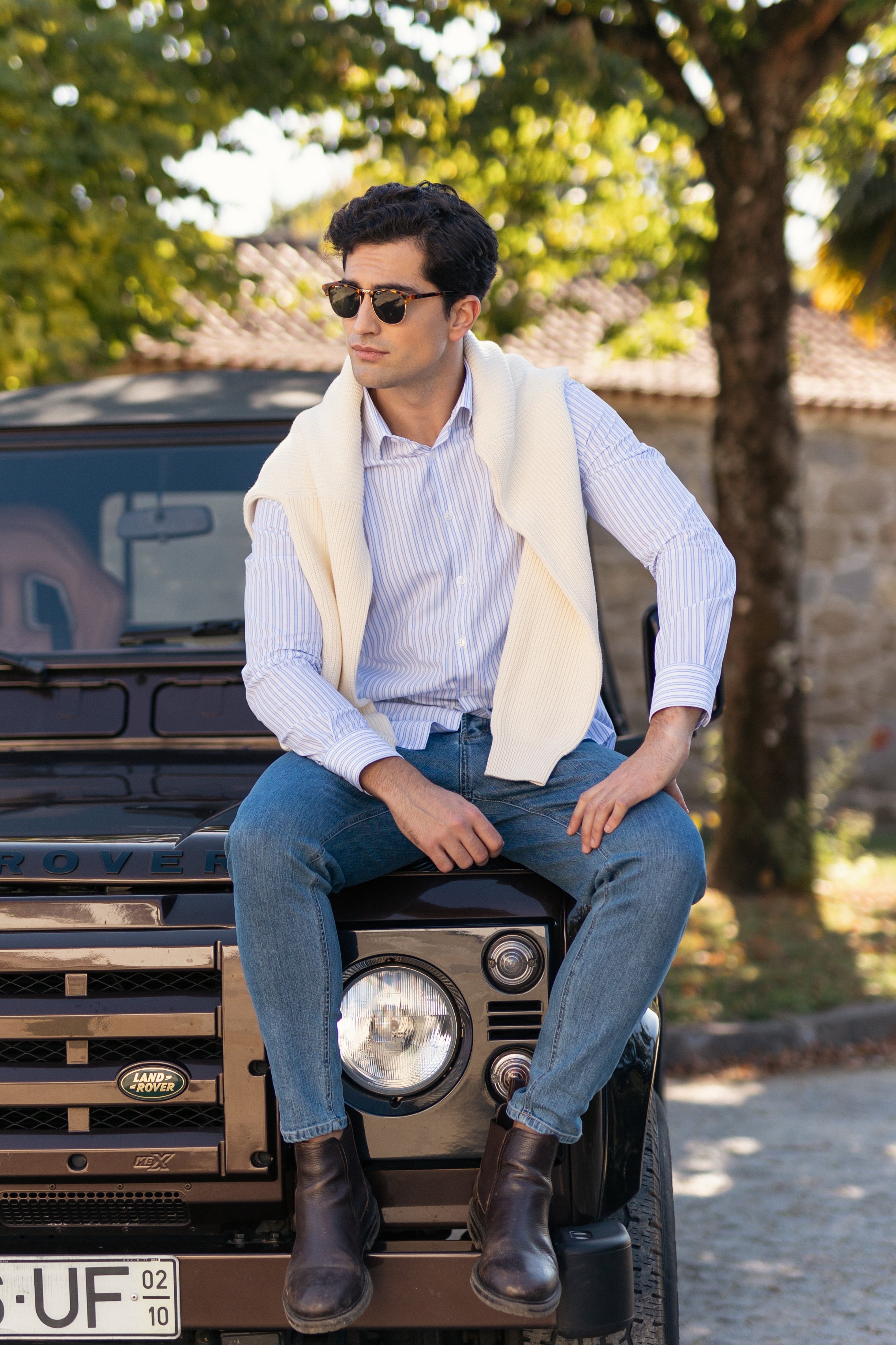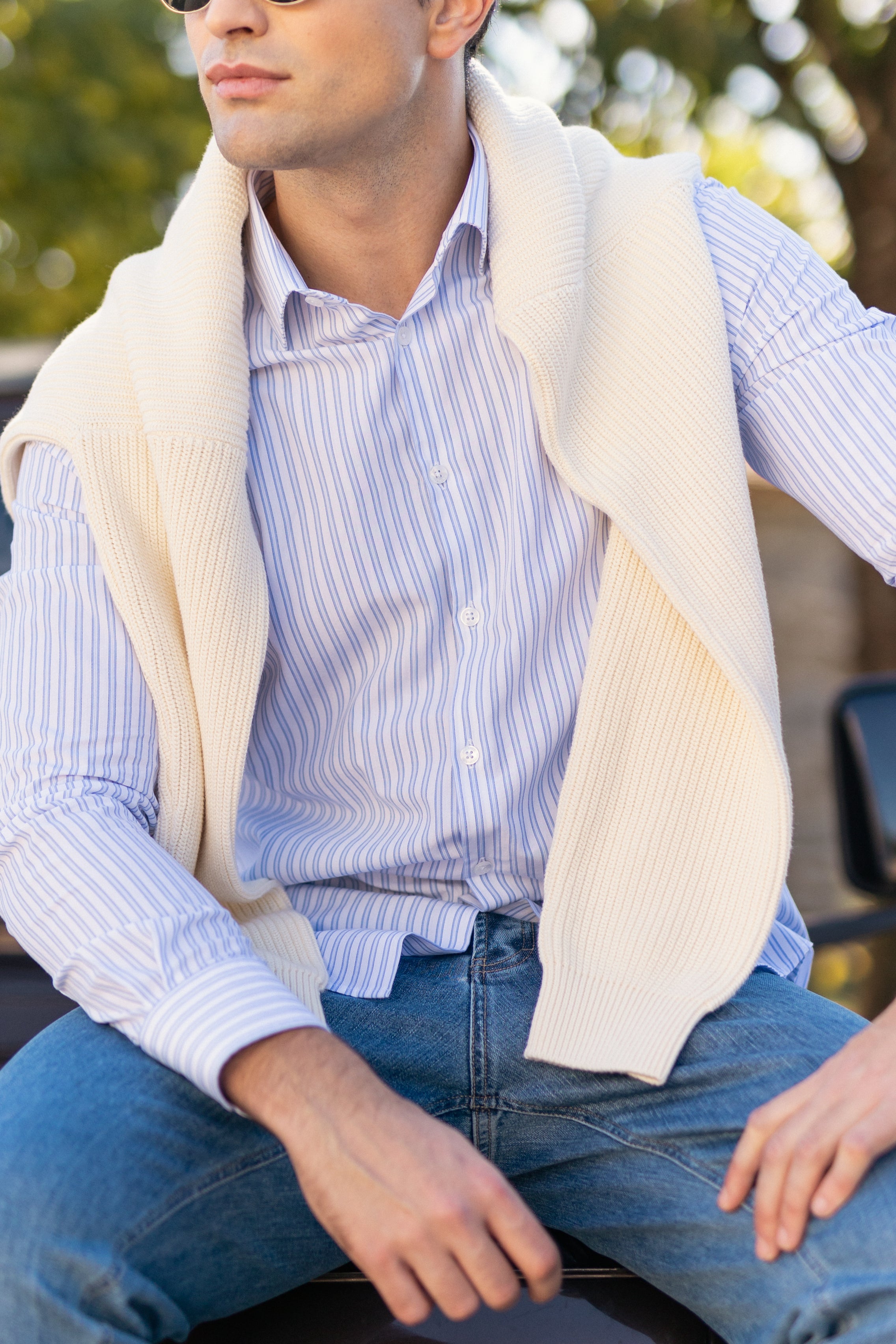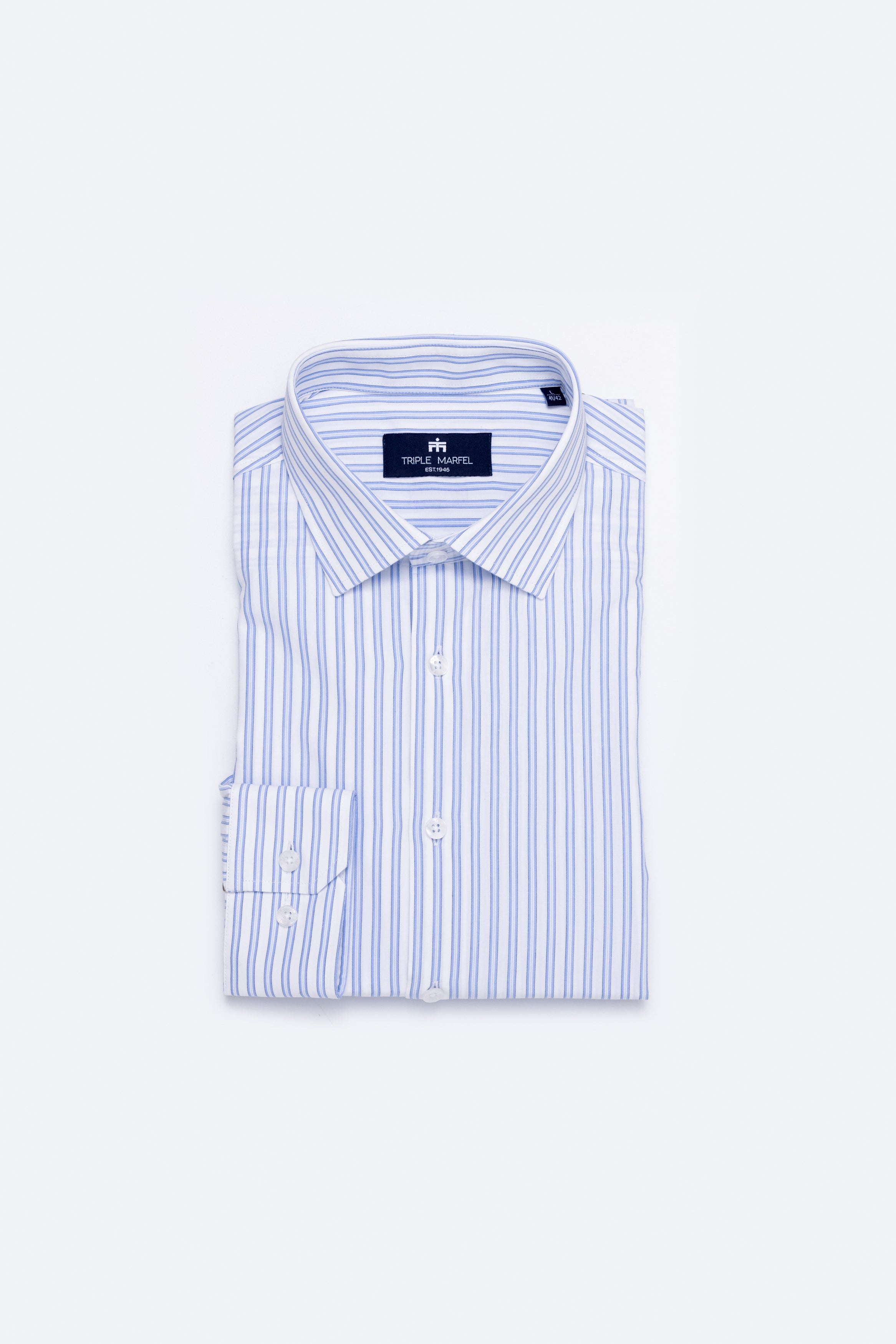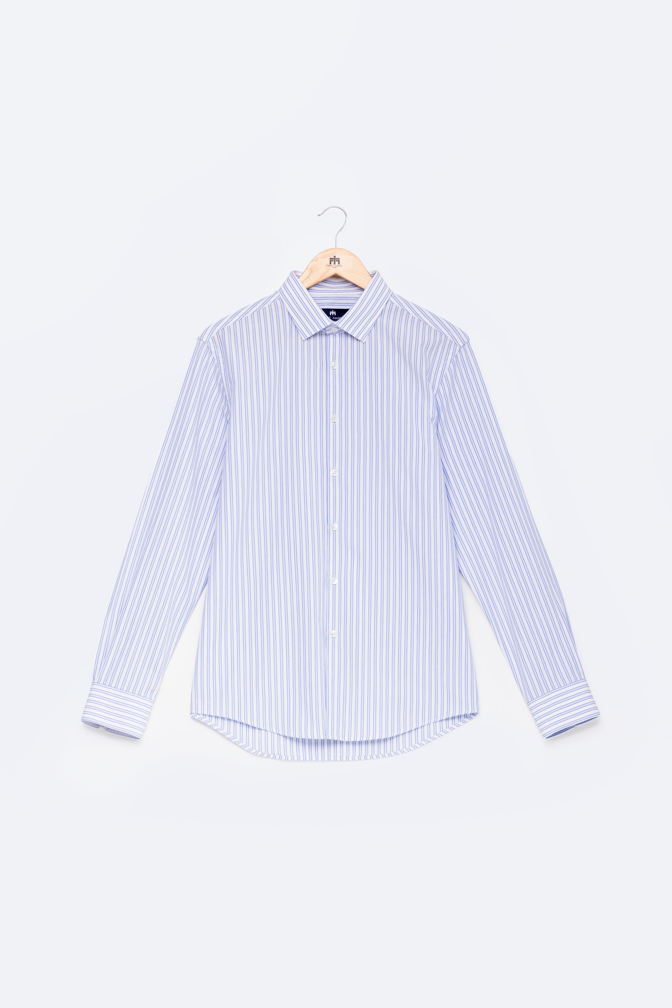Esta camisa de manga comprida com multi-riscas em branco e azul, é confecionada em tecido 100% algodão, produzido em Portugal por um dos nossos principais e melhores fornecedores. Com corte regular fit, apresenta colarinho italiano e é adornada com os nossos botões signature Triple Marfel, para um toque refinado e elegante.